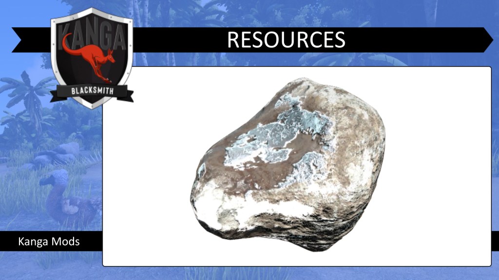 The Blacksmith mod adds 2 new metals that are harvested from there own unique metal nodes. Each metal node spawns in the spawn area of 2 dinos.