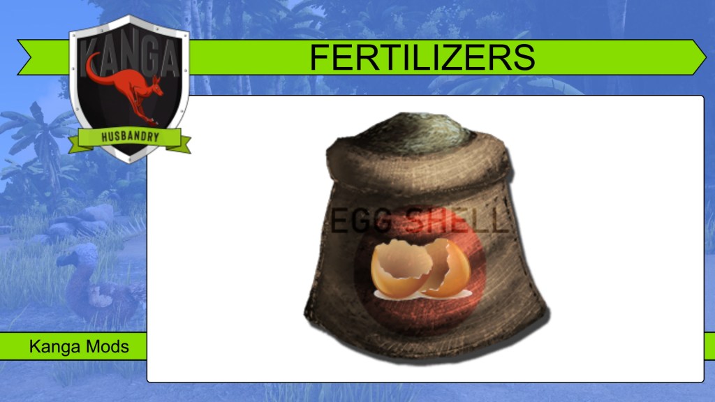 The Kanga Husbandry mods adds 9 tiers of fertilizer. Aside from a greater number of fertilizer points, a higher tier fertilizer also yields more harvest for your crop plots. Each fertilizer is needed to craft the next tier. All the fertilizers are crafted in the Kanga compost bin.