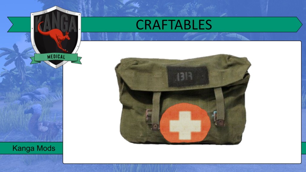 There are currently 3 different healing kits in the Kanga Medical mod. Each healing kit gives a certain amount of HP and bumps up your Internal and External Wellness Stats.