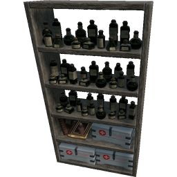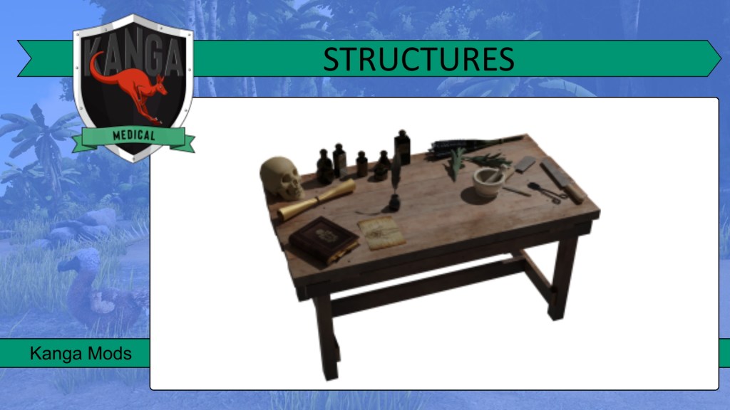 . crafts: medical crafting tables, grave, herb planters, medical cot, medical storage shelf, surgery work orders